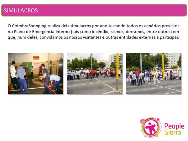 Além das SPO, fornecemos regularmente acções de formação em Segurança e Saúde aos colaboradores, lojistas e fornecedores de serviços em todos os países onde operamos e encontramo-nos localmente com os mesmos stakeholders nas Reuniões de Segurança e Saúde periódicas. Reconhecemos ainda a necessidade de garantir que os visitantes dos nossos centros comerciais estejam sujeitos a riscos mínimos de segurança e saúde. Tendo em conta o número de pessoas que nos visitam, conferimos a máxima atenção ao rigor dos planos de emergência que concebemos e ao ensaio dos mesmos em simulacros de emergência.